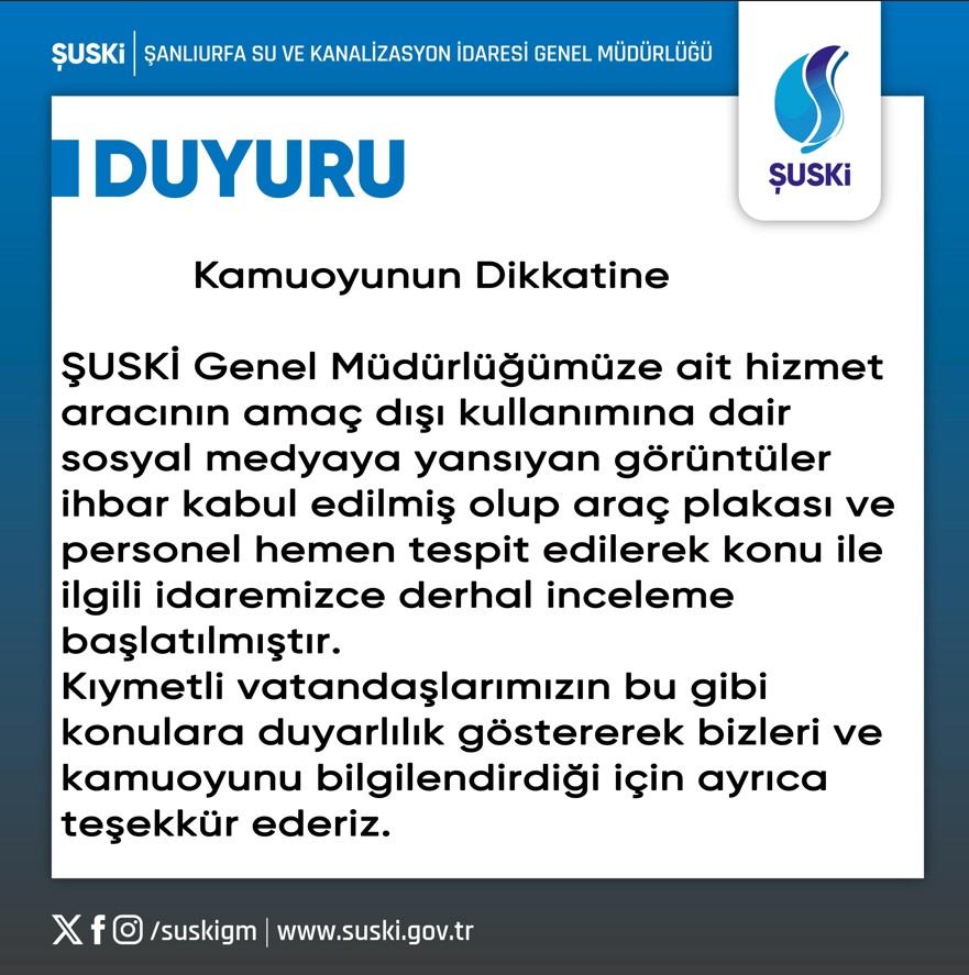 ŞUSKİ Genel Müdürlüğümüze ait hizmet aracının amaç dışı kullanımına dair sosyal medyaya yansıyan görüntüler ihbar kabul edilmiş olup araç plakası ve personel hemen tespit edilerek konu ile ilgili idaremizce derhal inceleme başlatılmıştır.