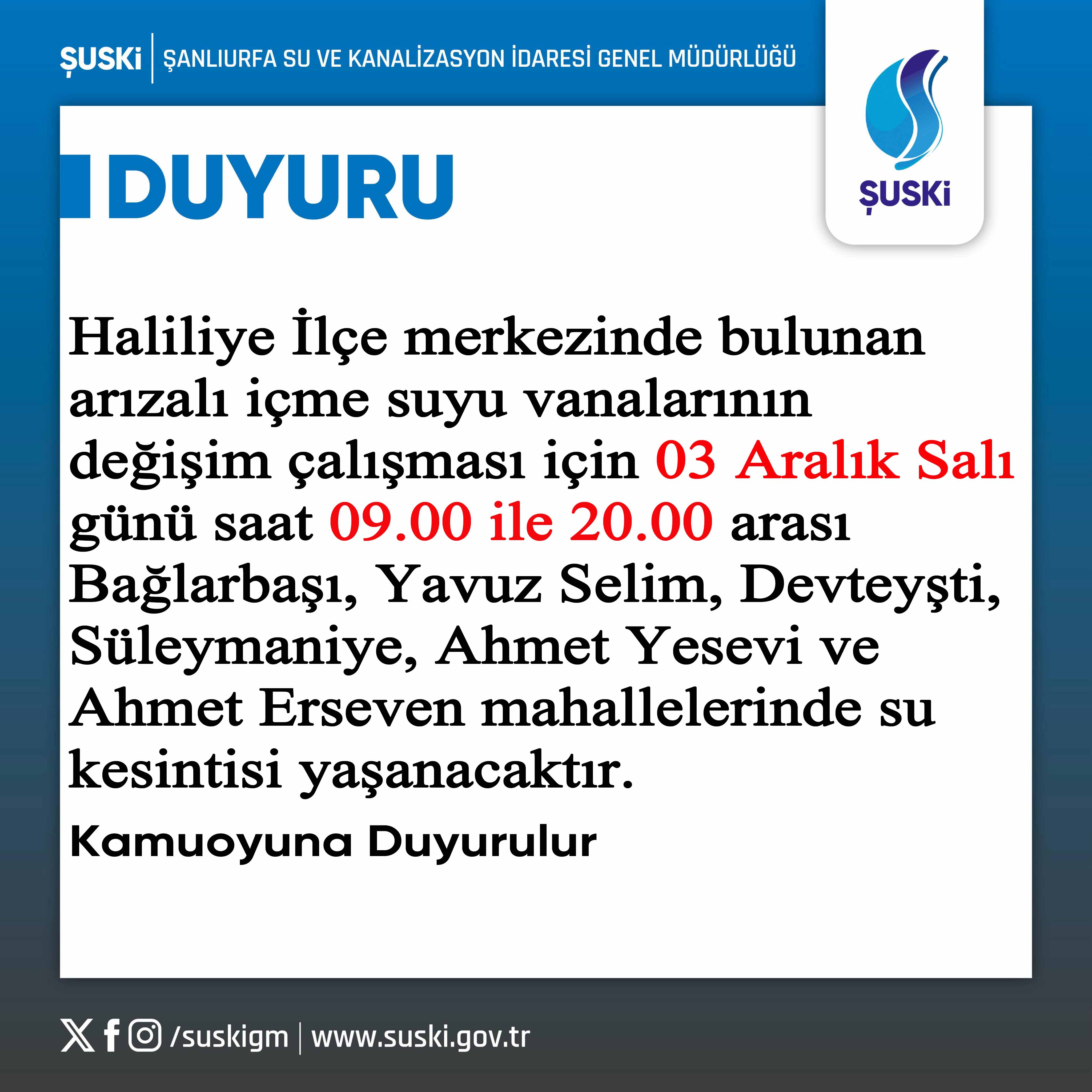 Haliliye ilçe merkezinde bulunan arızalı ime suyu vanalarının değişim çalışması için 03 Aralık Salı günü saat 09.00 ile 20.00 arası Baglarbas1, Yavuz Selim, Devteyşti, Süleymaniye, Ahmet Yesevi ve Ahmet Erseven mahallelerinde su kesintisi yaşanacaktır.
