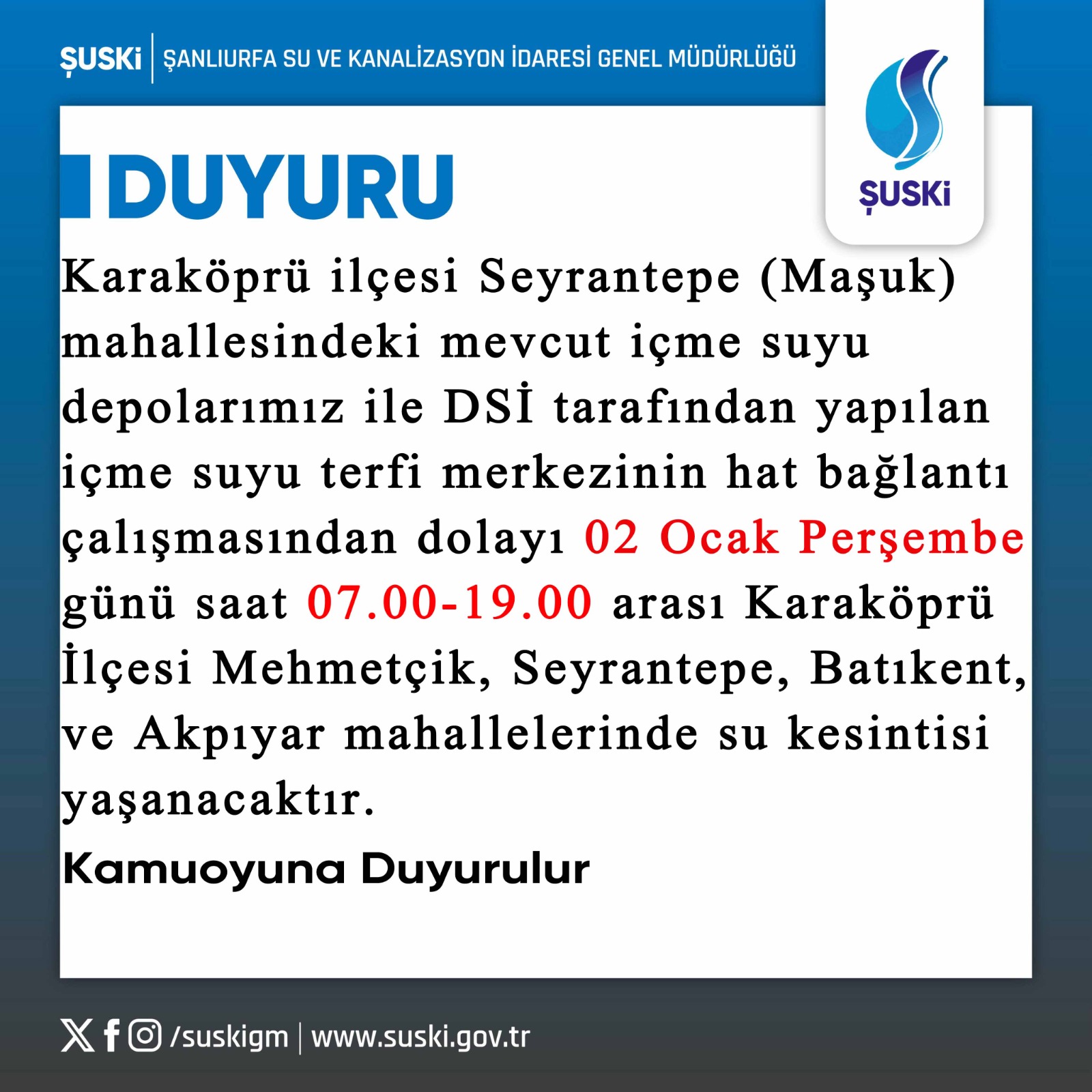 Karaköprü ilçesi Seyrantepe (Maşuk) mahallesindeki mevcut içme suyu depolarımız ile DSİ tarafından yapılan içme suyu terfi merkezinin hat bağlantı çalışması nedeni ile 02 Ocak Perşembe günü saat 07.00-19.00 arası Karaköprü İlçesi Mehmetçik, Seyrantepe, Batıkent, ve Akpiyar Mahallelerinde su kesintisi yaşanacaktır.