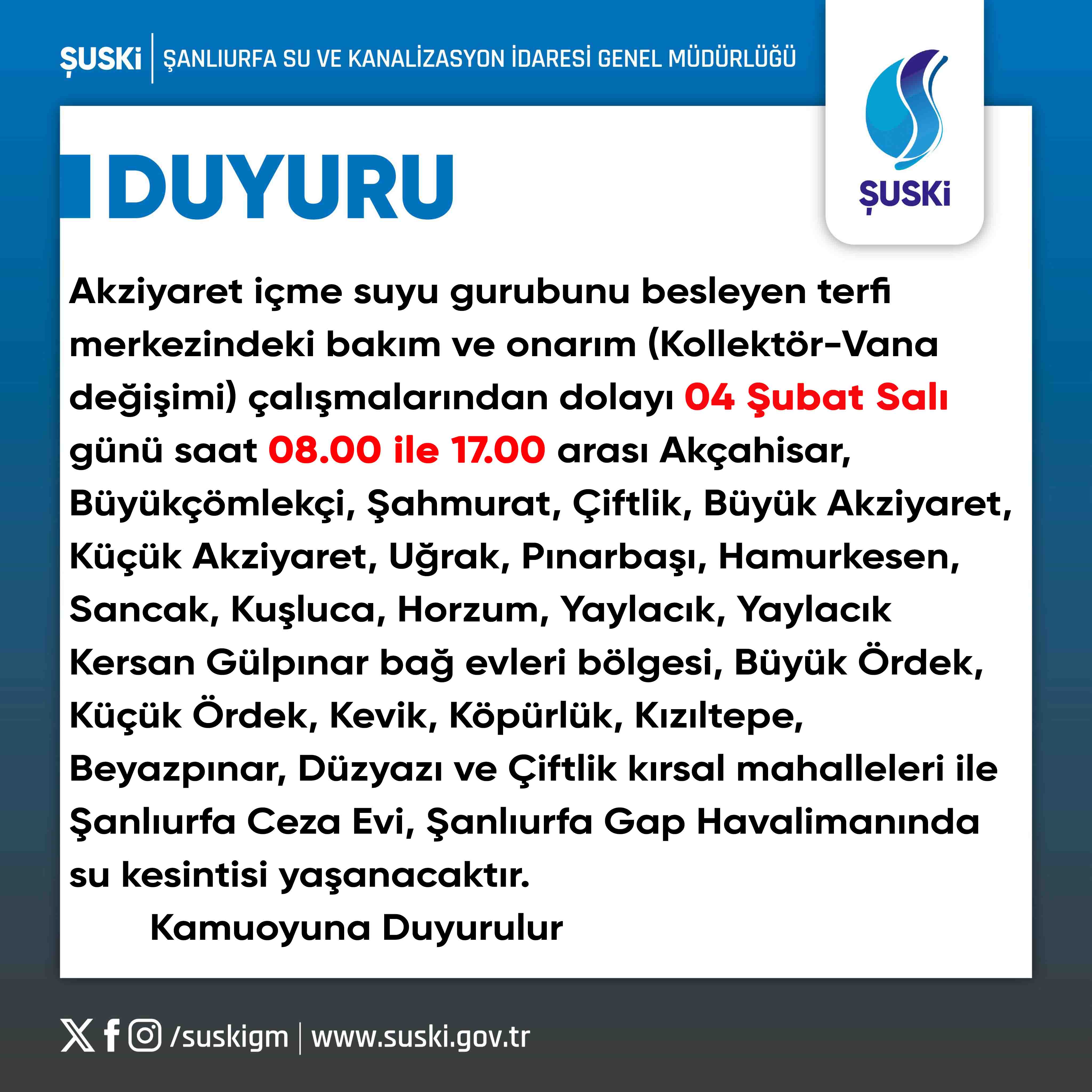 Akziyaret içme suyu gurubunu besleyen terfi merkezindeki bakım ve onarım (Kollektör-Vana değişimi) çalışmalarından dolayı 04 Şubat Salı günü saat 08.00 ile 17.00 arası Akçahisar, Büyükçömlekçi, Şahmurat, Çiftlik, Büyük Akziyaret, Küçük Akziyaret, Uğrak, Pınarbaşı, Hamurkesen, Sancak, Kuşluca, Horzum, Yaylacık, Yaylacık Kersan Gülpınar bağ evleri bölgesi, Büyük Ördek, Küçük Ördek, Kevik, Köpürlük, Kızıltepe, Beyazpınar, Düzyazı ve Çiftlik kırsal mahalleleri ile Şanlıurfa Ceza Evi, Şanlıurfa Gap Havalimanında su kesintisi yaşanacaktır.
