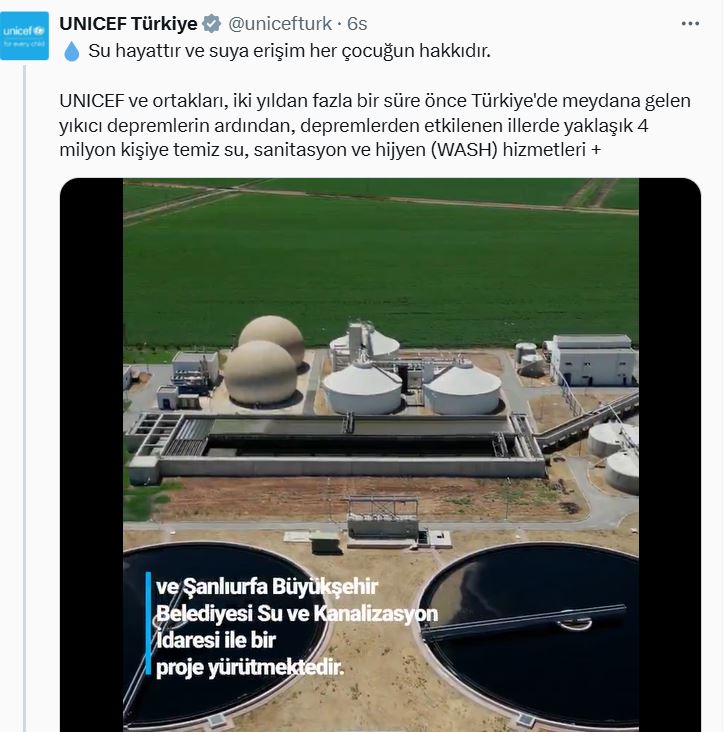Su hayattır ve suya erişim her çocuğun hakkıdır. UNICEF ve ortakları, iki yıldan fazla bir süre önce Türkiye'de meydana gelen yıkıcı depremlerin ardından, depremlerden etkilenen illerde yaklaşık 4 milyon kişiye temiz su, sanitasyon ve hijyen (WASH) hizmetleri sağlamaya devam ederken, iklime dayanıklı su, sanitasyon ve hijyen (WASH) girişimlerini de hayata geçirmektedir.