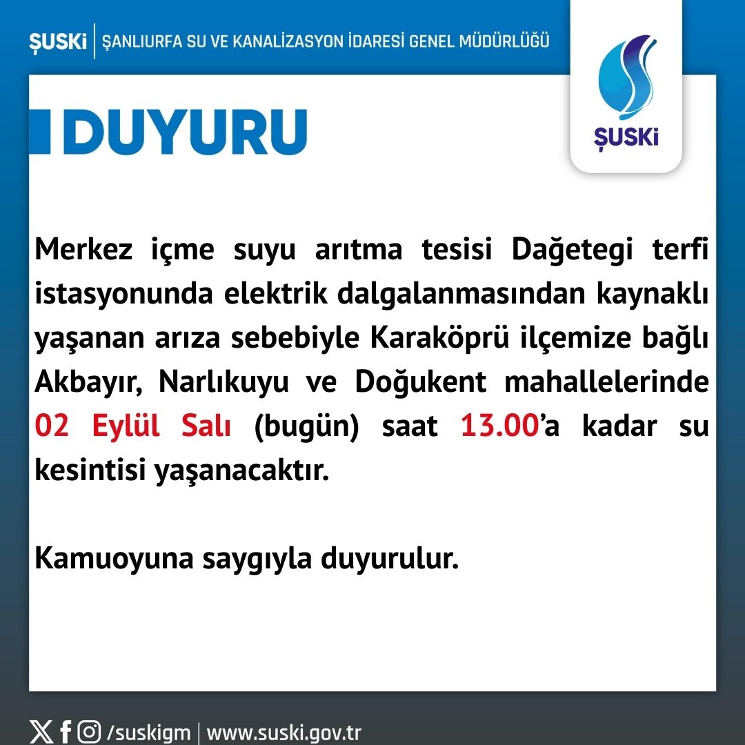 Merkez içme suyu arıtma tesisi Dağetegi terfi istasyonunda elektrik dalgalanmasından kaynaklı yaşanan arıza sebebiyle Karaköprü ilçemize bağlı Akbayır, Narlıkuyu ve Doğukent mahallelerinde 02 Eylül Salı (bugün) saat 13.00’a kadar su kesintisi yaşanacaktır.