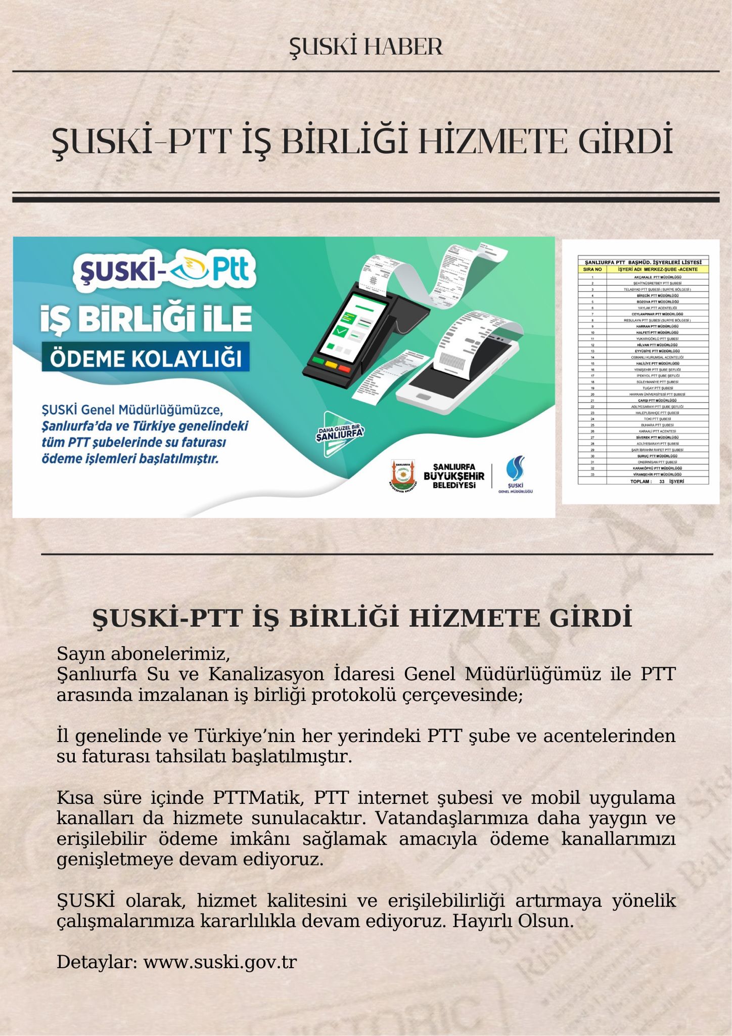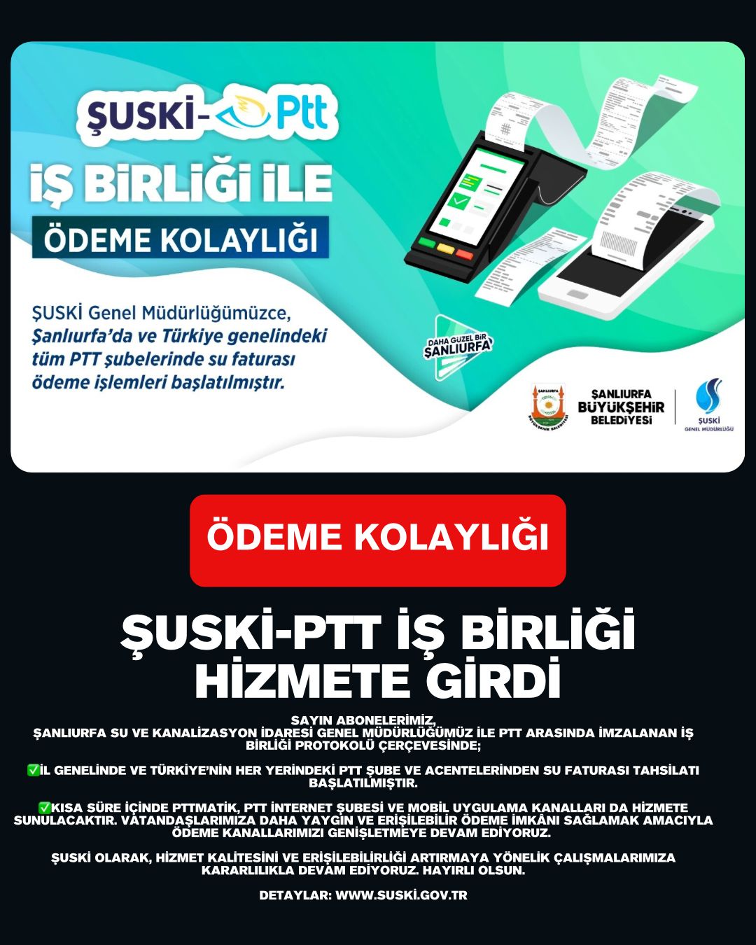 PTT ile ŞUSKİ Genel Müdürlüğümüzün yapmış olduğu protokol kapsamında il genelinde PTT’ye ait tüm şube ve acentelerden tahsilat işlemleri başlatılmıştır. ŞUSKİ abonesi vatandaşlarımız, fatura bedellerini Türkiye genelindeki herhangi bir PTT işyerinden veya uygulamanın hazır hale gelmesi durumunda PTT’nin alternatif ödeme kanallarından (PTTMatik, PTT internet şubesi ve mobil bankacılık) ödeyebilecektir. Vatandaşlarımıza daha fazla ödeme kolaylığı sağlamak amacıyla PTT ile yaptığımız bu anlaşma sayesinde ödeme kanallarımızı genişletmeye ve hizmet kalitemizi artırmaya devam edeceğiz.